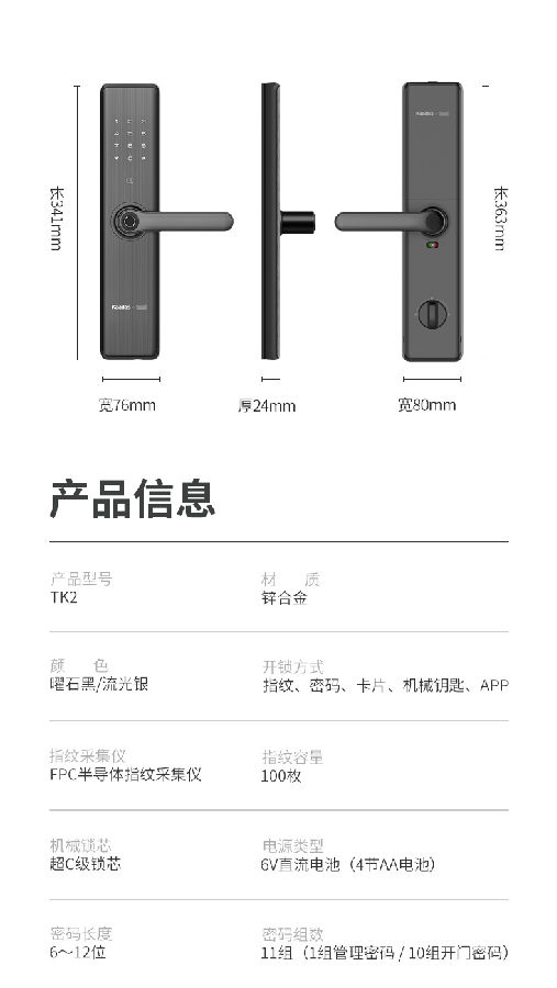 凱迪仕智能鎖TK2 指紋鎖家用防盜門電子門鎖密碼鎖 支持手機(jī)App的鎖