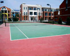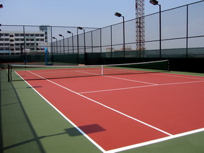 這是一種現(xiàn)場澆鋪用刮板制作在瀝青混凝土上或鋼盤混凝土結(jié)構(gòu)地面上的新型材,其工藝主要分為找平結(jié)合層、加強(qiáng)層、耐磨層等多層做法,還有含膠粒的多層做法這種面層材料及工藝的優(yōu)點(diǎn)是平整度高、表面硬度高、耐磨、抗曬、色澤鮮艷、使用壽命長便于管理和維修。這種面層材質(zhì)穩(wěn)定的網(wǎng)球場近年來已開始在世界各地普遍采用,管它球速稍快,較之其它類型球場,球的彈跳平衡,球員場上跑動舒服,是一種既可供娛樂打球也可用做正規(guī)比賽的高檔次網(wǎng)球場地。